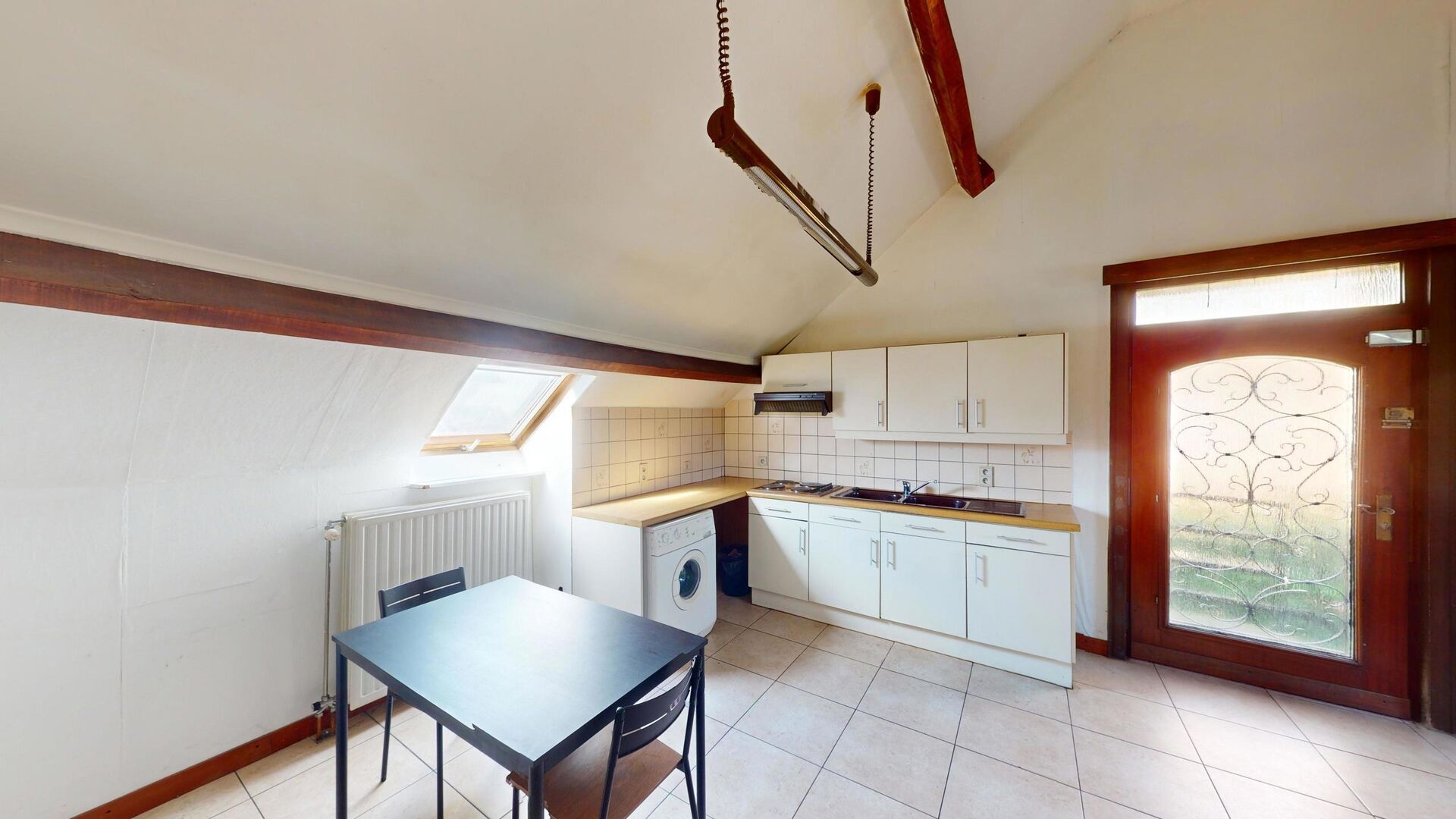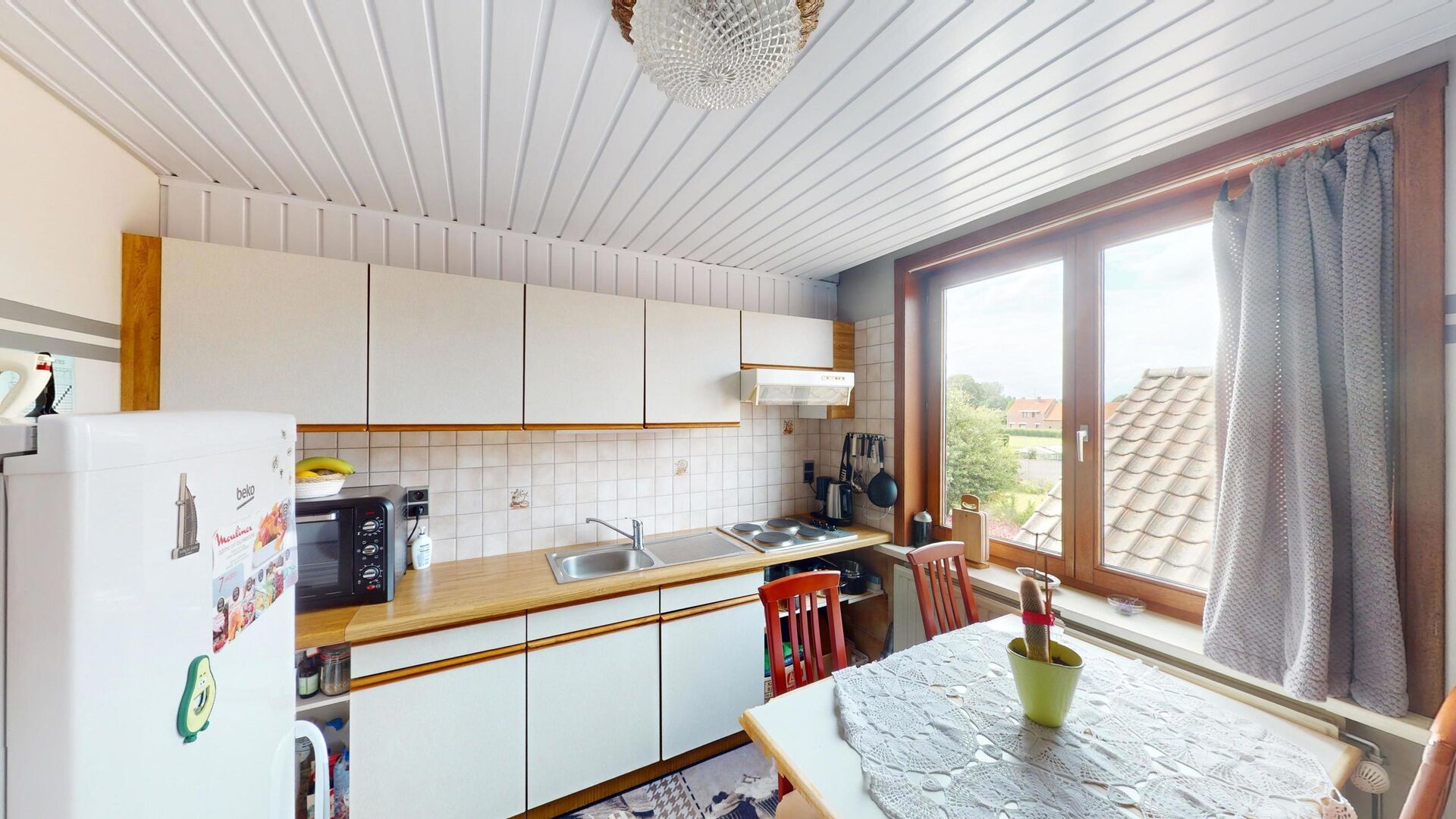 Naast de leefruimte komen we in de deels geïnstalleerde keuken, waar we oa een elektrisch vuur hebben. Hier is voldoende ruimte voorzien om een tafel en stoelen te plaatsen.