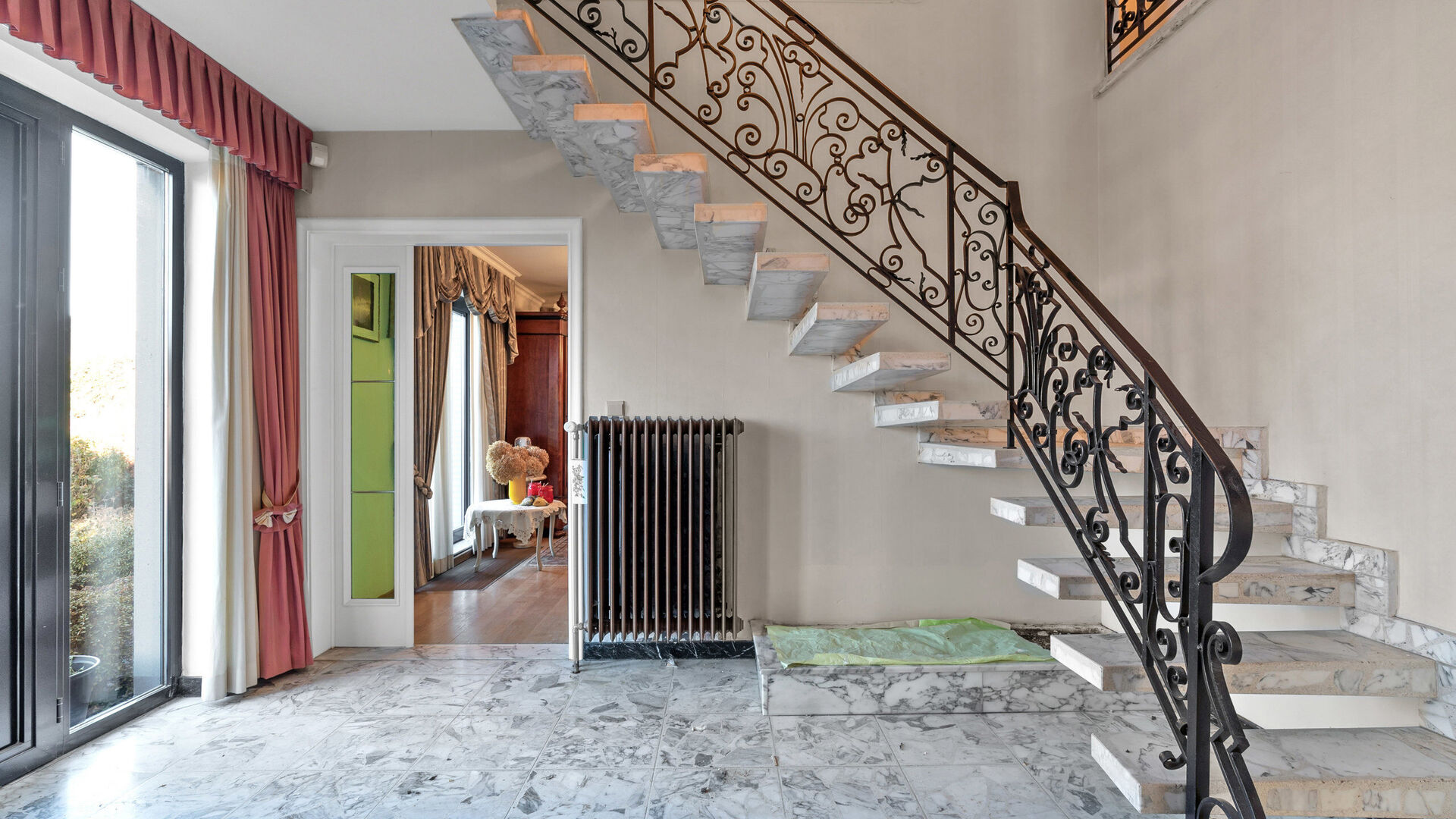 - Volledige marmeren inkomhal met smidijzeren handgemaakte trapleuning