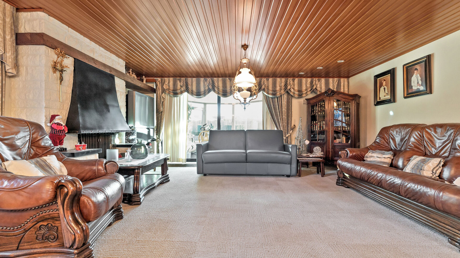 De ruime keuken is volledig uitgerust met alle hedendaags comfort en veel kastruimte. Grote ramen kijken uit op de veranda. Vanuit de keuken én de inkomhal bereik je de gezellige leefruimte met eetplaats en salon. Dankzij de grote ramen geniet je hier de hele dag van natuurlijke lichtinval. De eetruimte heeft parket, het salon een zacht tapijt, en de echte houtgestookte haard zorgt voor extra sfeer. Een grote schuifraam leidt naar de veranda.