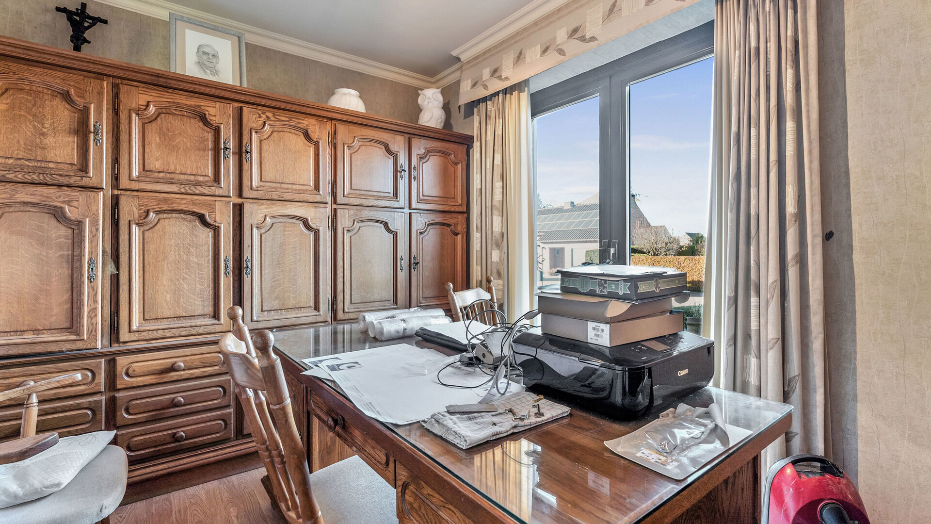 Achter de keuken bevindt zich nog een sas met achterdeur. Hieraan grenst een extra kamer die perfect kan dienen als hobbyruimte of bijkomende badkamer. Deze ruimte is voorzien van airco en een grote schuifraam naar buiten. De veranda zelf is volledig omringd door glas, met tegelvloer, zonwerend dakglas, vliegenramen, verwarming en spotjes—een heerlijke plek om het hele jaar door te genieten.