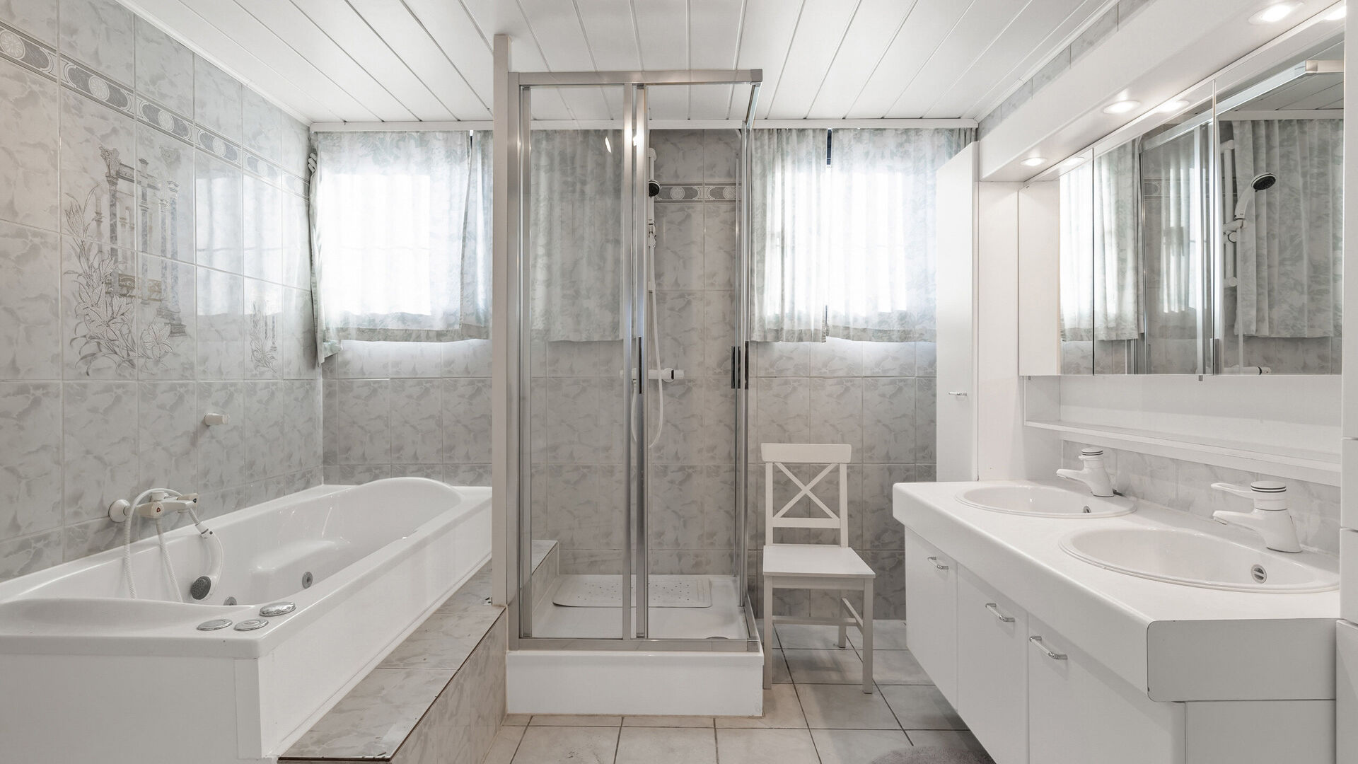 De badkamer is volledig betegeld, ze beschikt over een bubbelbad, een aparte douchecabine, dubbele lavabo, verwarming en een draai/kipraam met vliegenraam.