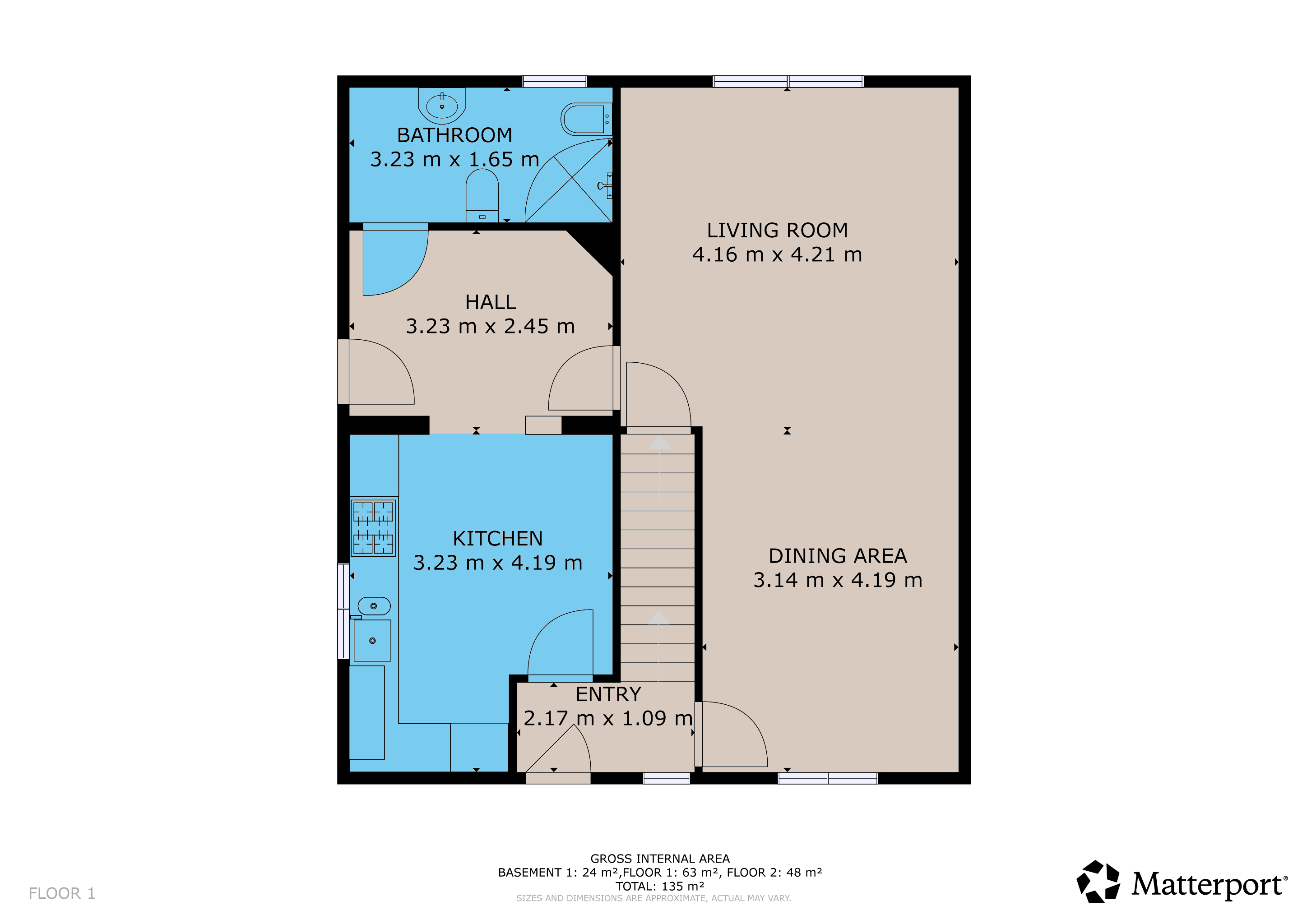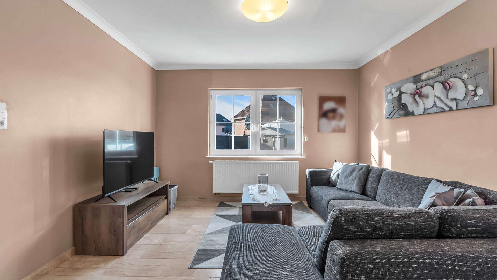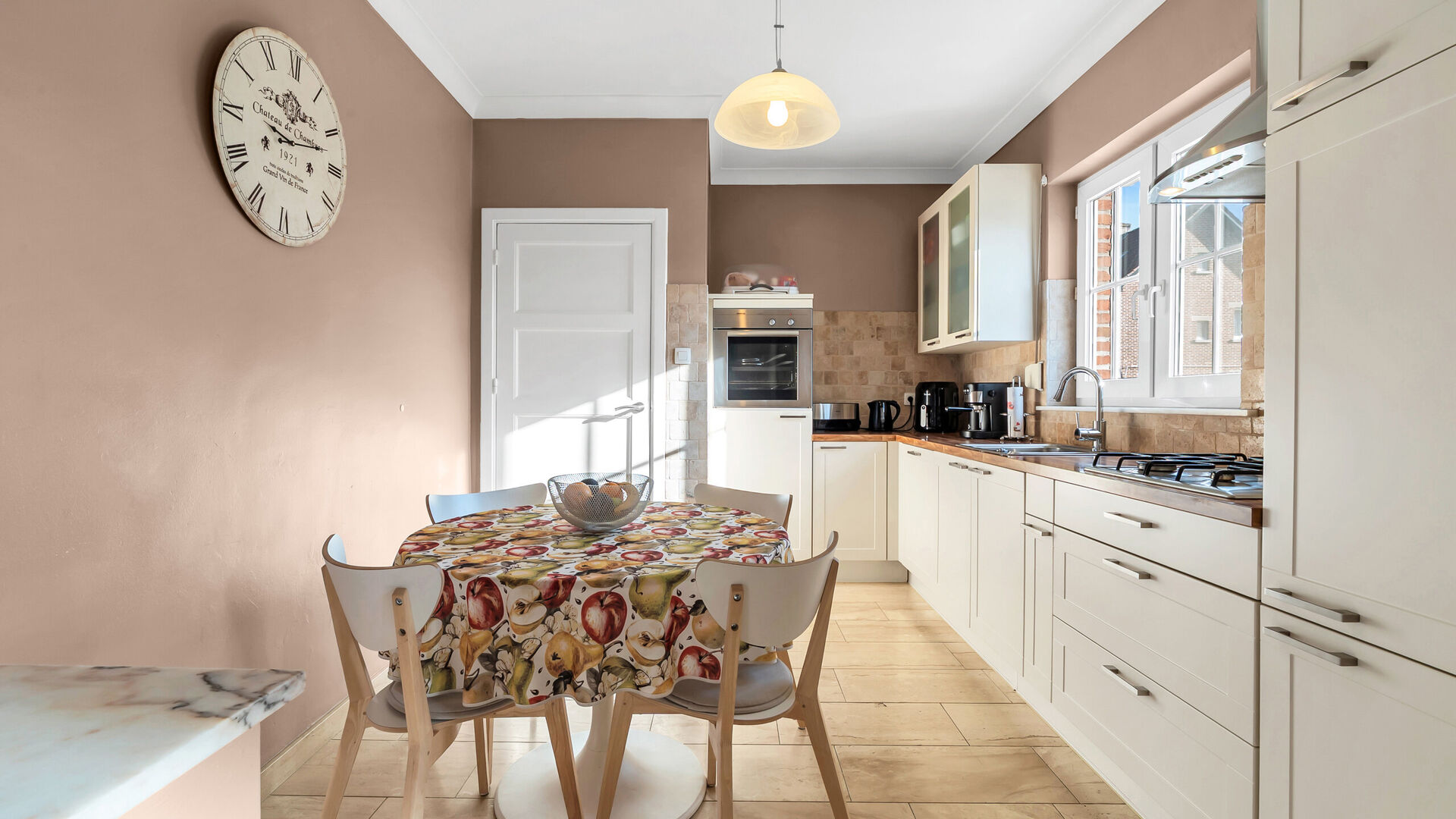 Bij het betreden van de woning komt u in de inkomhal die toegang geeft tot zowel de leefruimte als de keuken. Rechts bevindt zich de gezellige leefruimte, afgewerkt met een elegante marmeren vloer en veel natuurlijke lichtinval. Links vindt u de praktische keuken, voorzien van een gasvuur en combi-oven. Beide ruimtes lopen achteraan mooi in elkaar over via een tussenhal, waardoor er een aangename connectie is zonder in te boeten aan privacy.