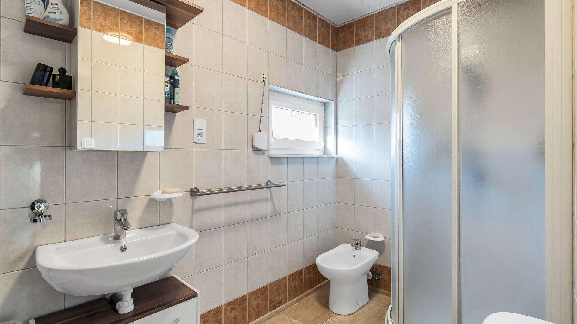 Aansluitend aan de keuken bevindt zich de badkamer, uitgerust met douche, toilet en lavabo.