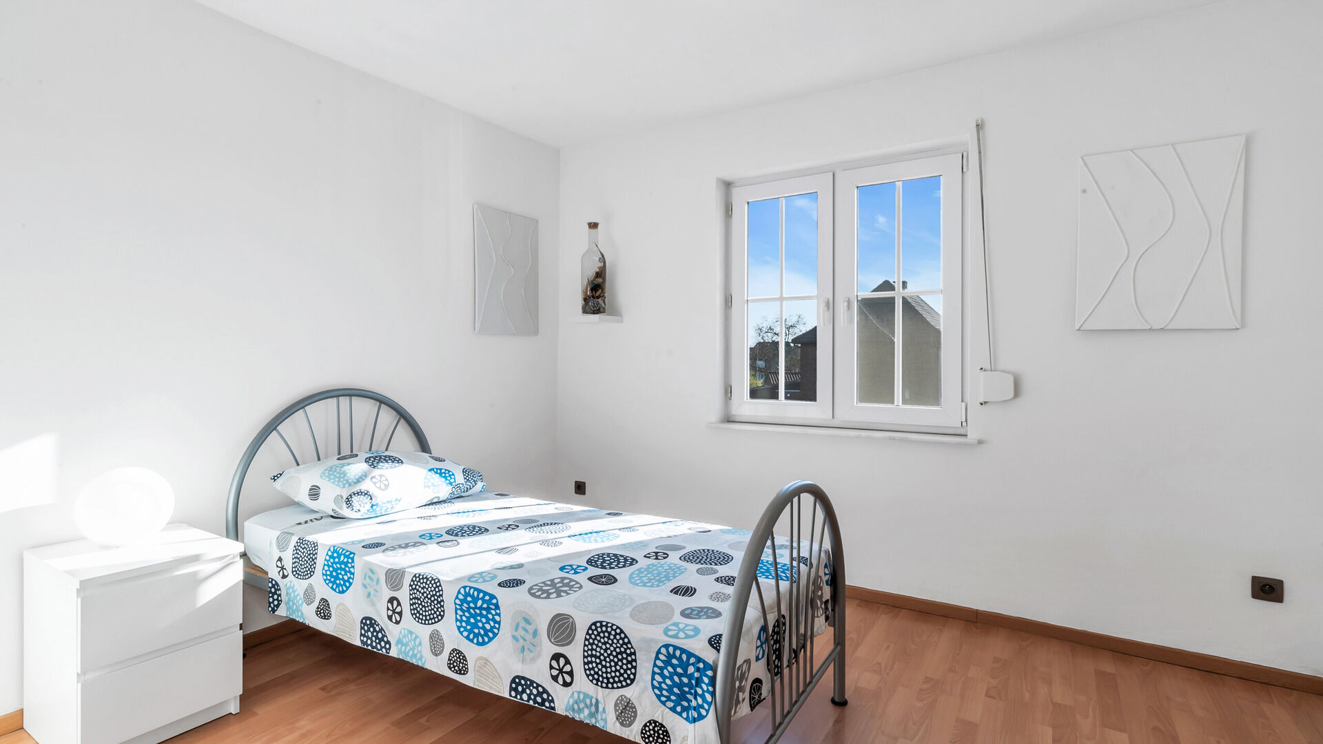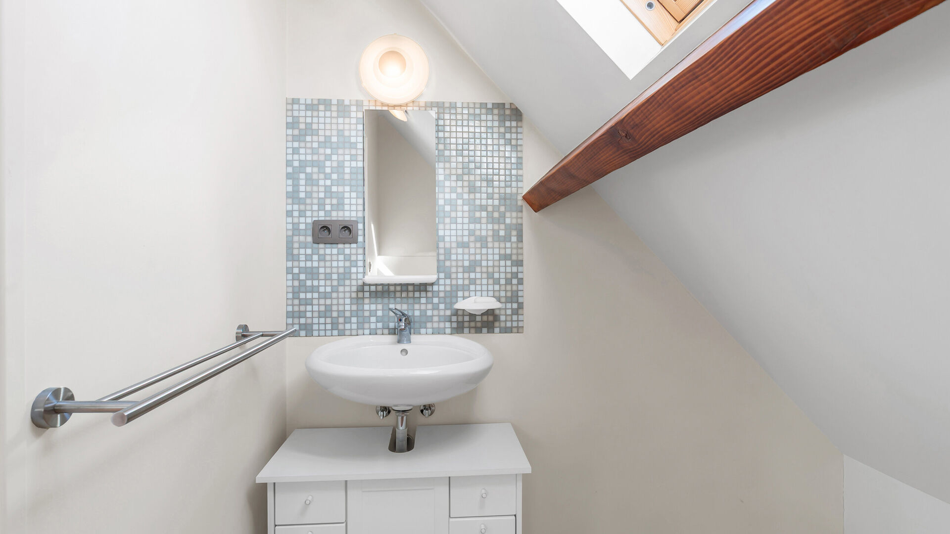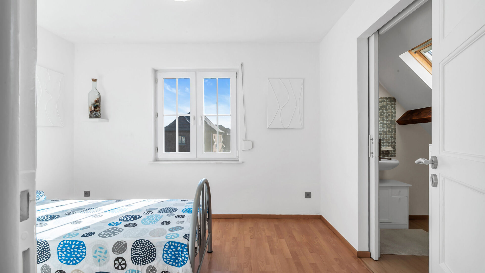 Op de verdieping bereikt u via een houten trap drie slaapkamers, waarvan twee ruime en één veelzijdige kamer die perfect kan dienen als kinder-, bureau- of hobbyruimte. Eén van de slaapkamers beschikt bovendien over een eigen lavabo en toilet. De bovenverdieping is volledig afgewerkt met een warme laminaatvloer en geniet van extra licht dankzij de dakramen.