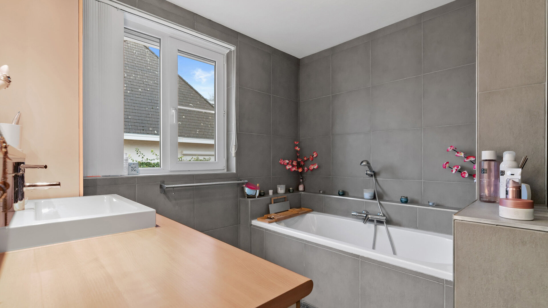De badkamer is eveneens recent gerenoveerd en is uitgerust met een ligbad, aparte douche, lavabo en wandkasten.
