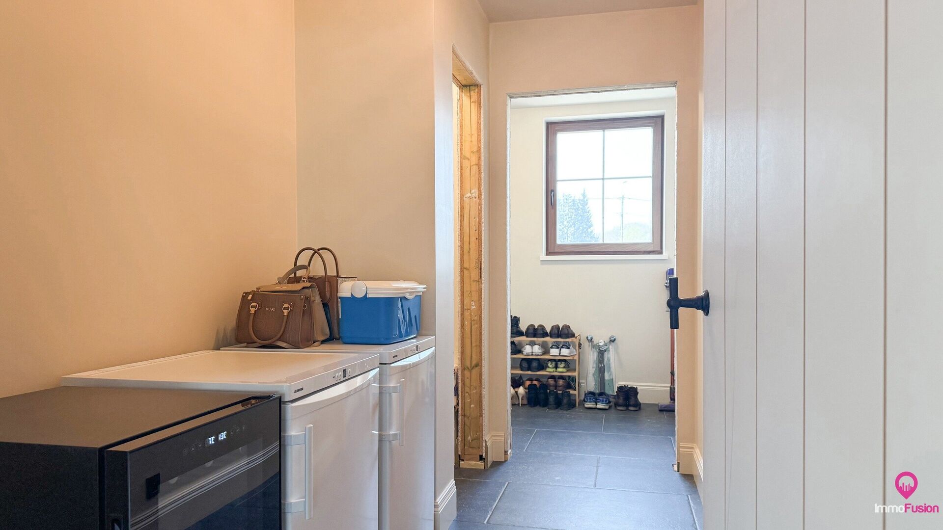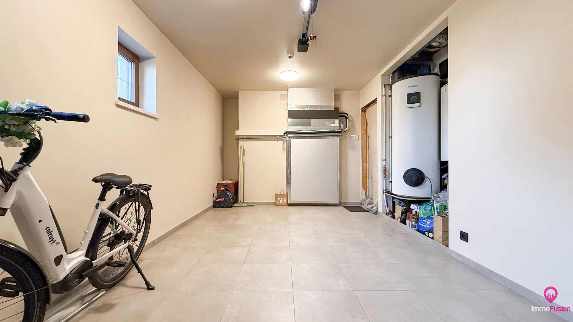 Achter de keuken bevindt zich de praktische berging en technische ruimte met alle nodige aansluitingen, vanwaar men ook toegang heeft tot de inpandige garage.