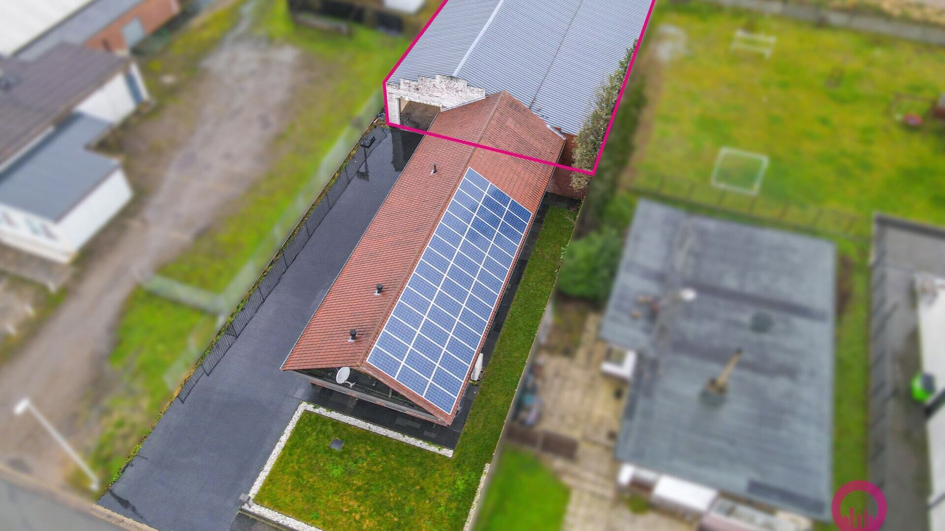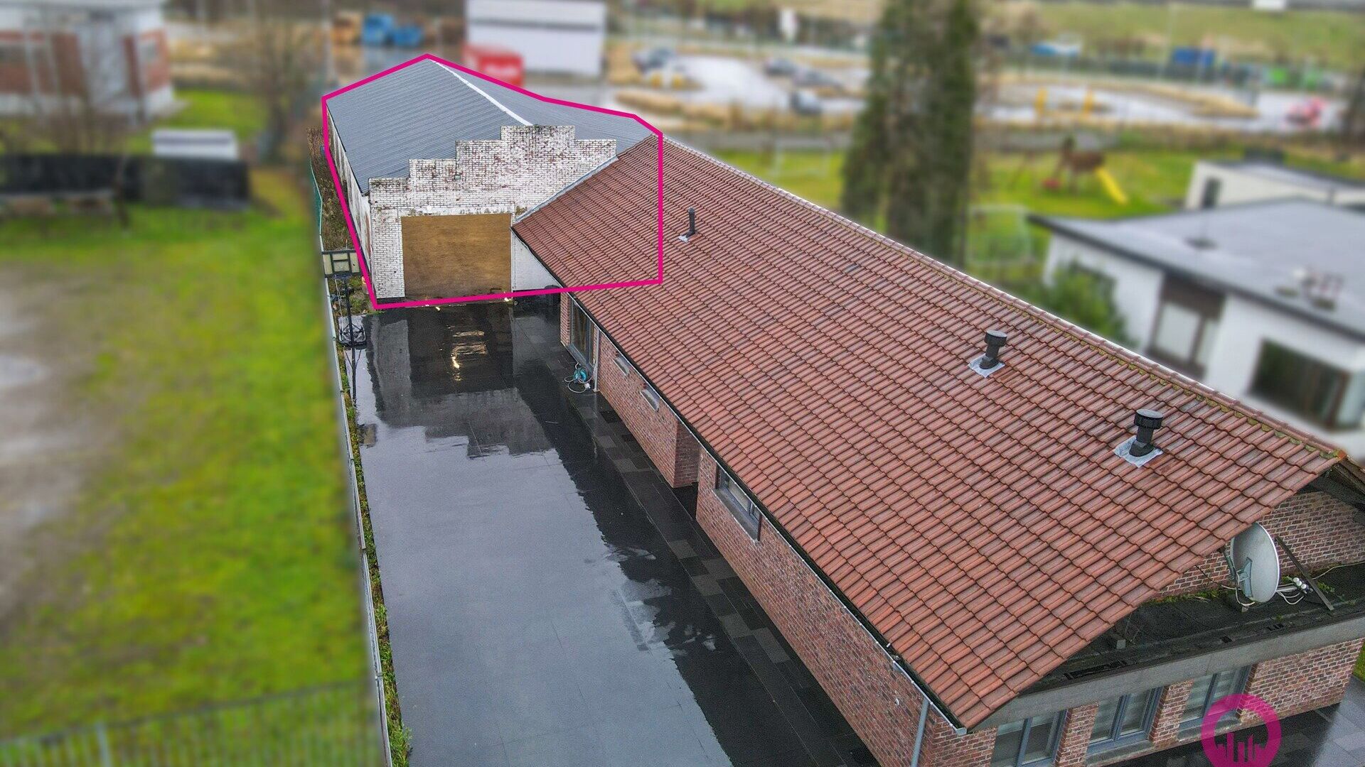 Inrit links langs ander gebouw : open polyvalente ruimte, werkhuis toilet