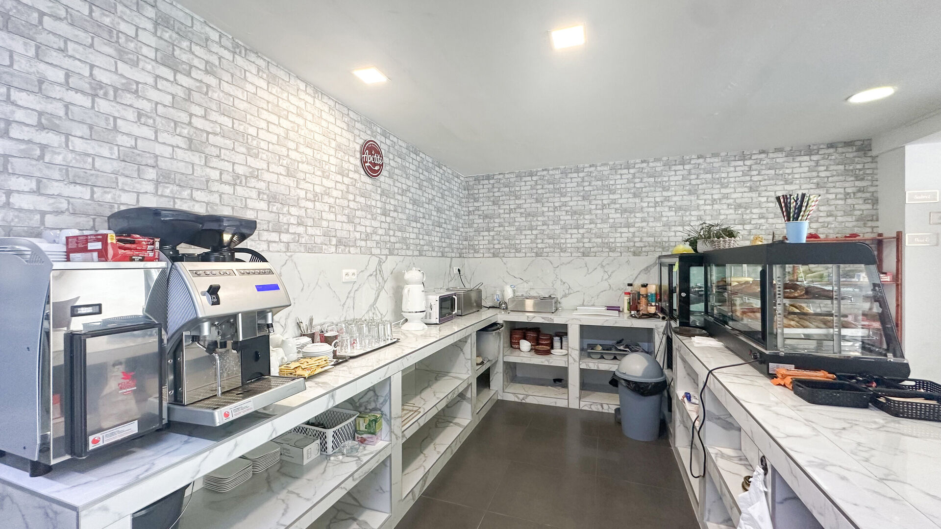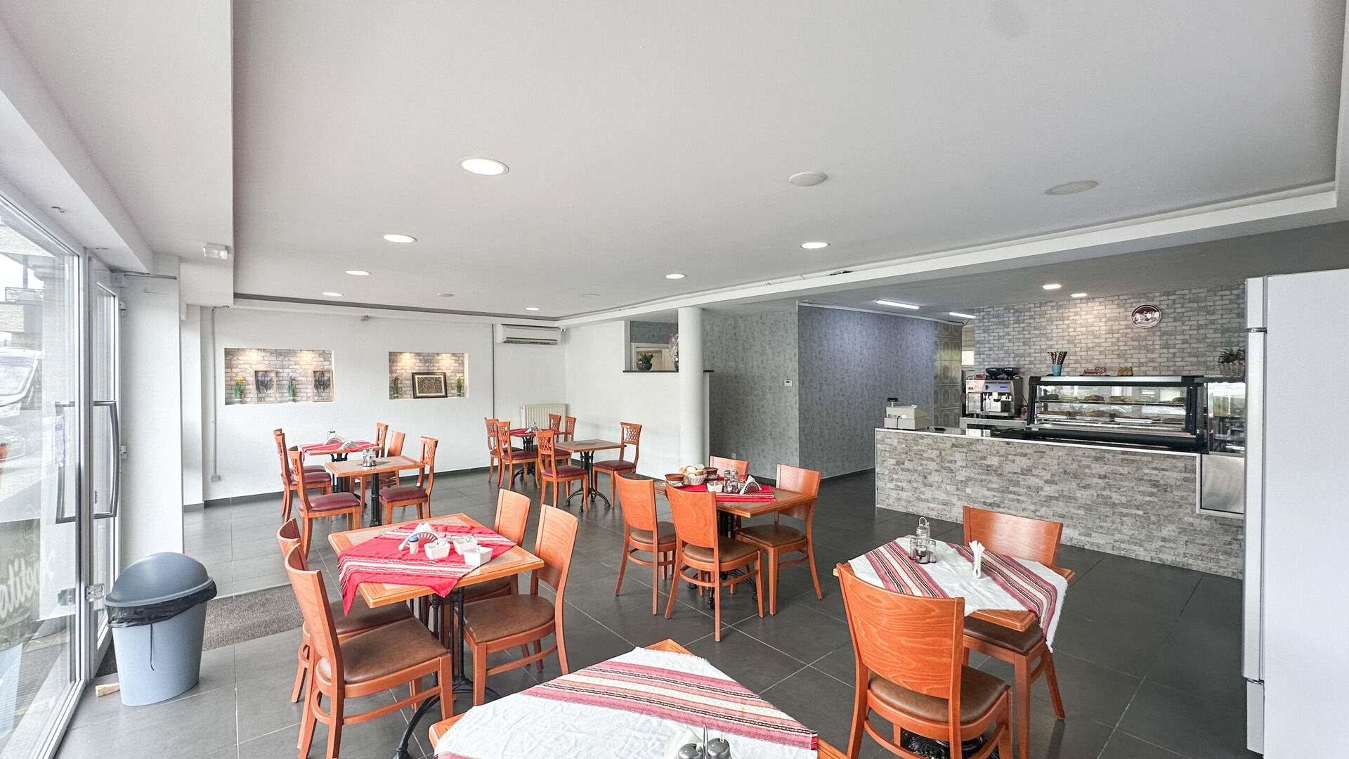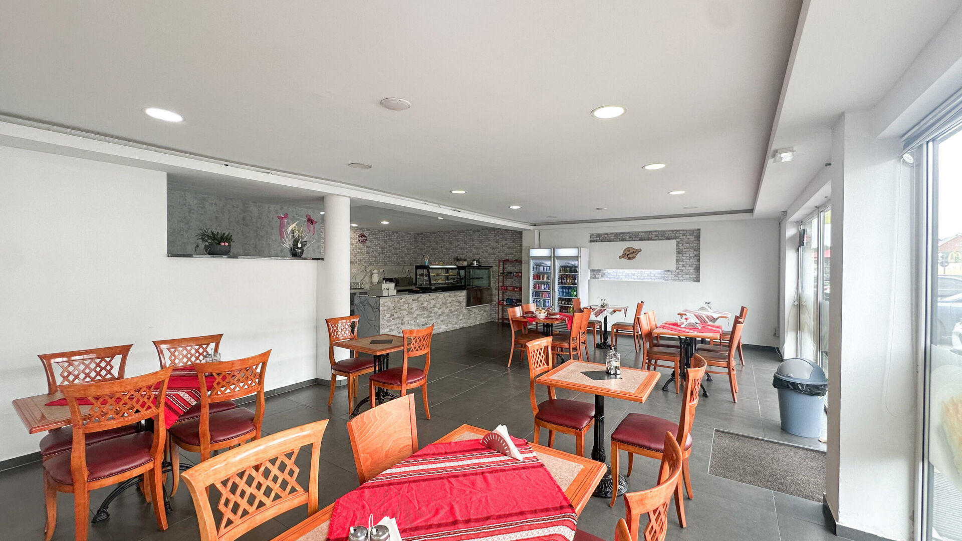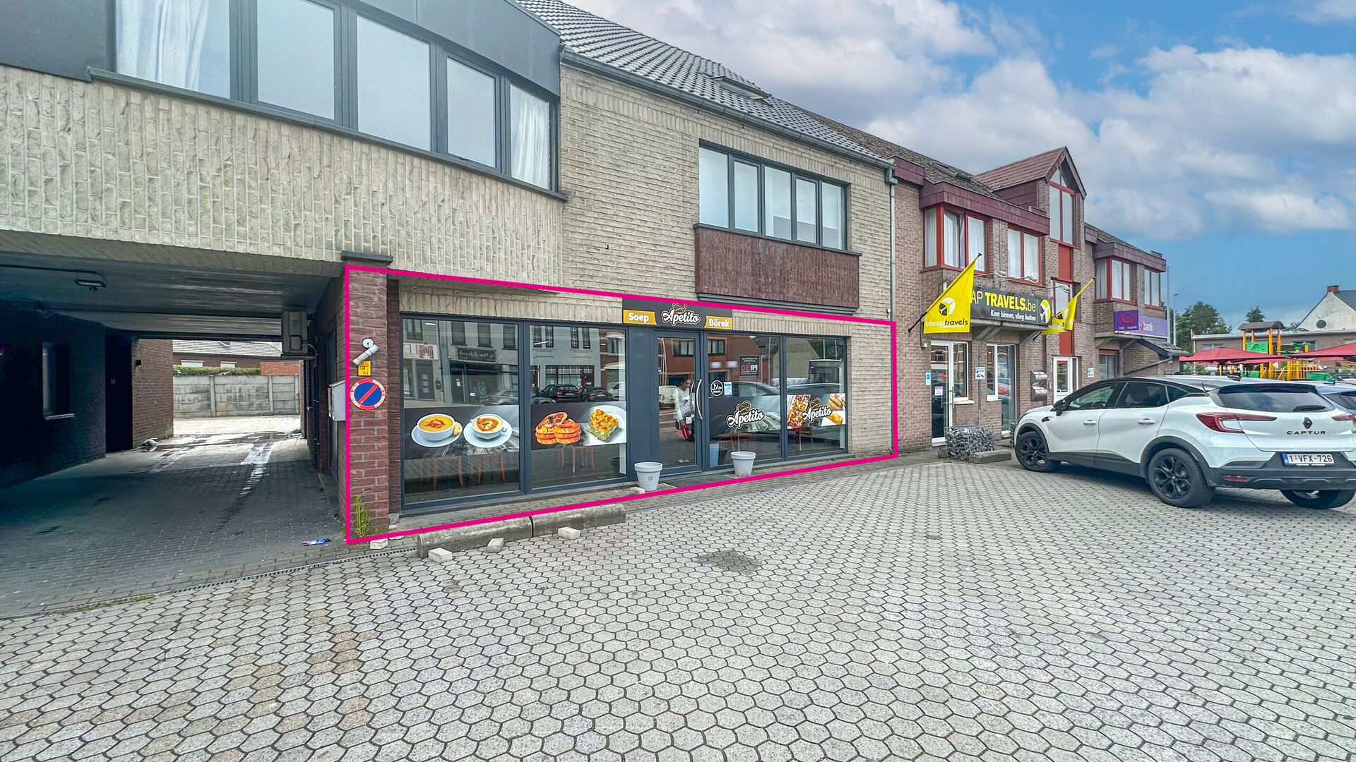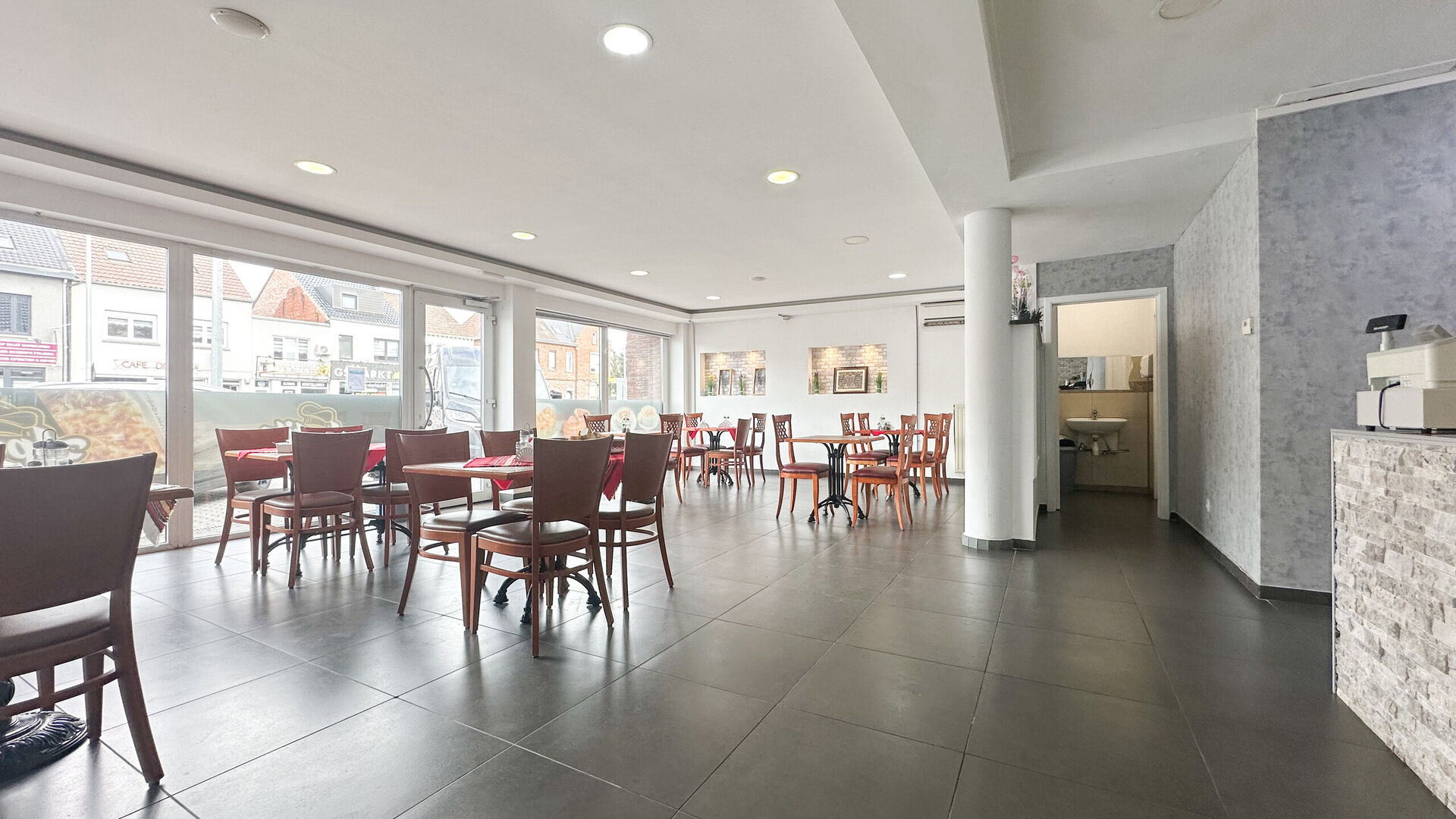 Aan de voorzijde is er een groot uitstalraam om de mogelijke klanten naar binnen te trekken alsook voldoende parkeergelegenheid voor de deur en langs de straat. Achter is er nog een toiletruimte, een aparte zitruimte en een zeer ruime keuken.