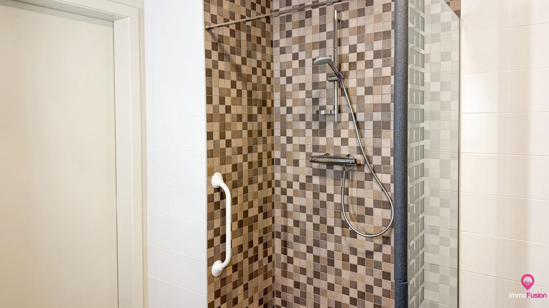 De slaapkamer is bijzonder ruim en beschikt over een rechtstreekse toegang tot het terras, wat zorgt voor extra licht en een aangenaam gevoel van openheid. De badkamer is praktisch en veilig ingericht met een open douche, lavabo en toilet met leuning, volledig afgestemd op comfortabel wonen.