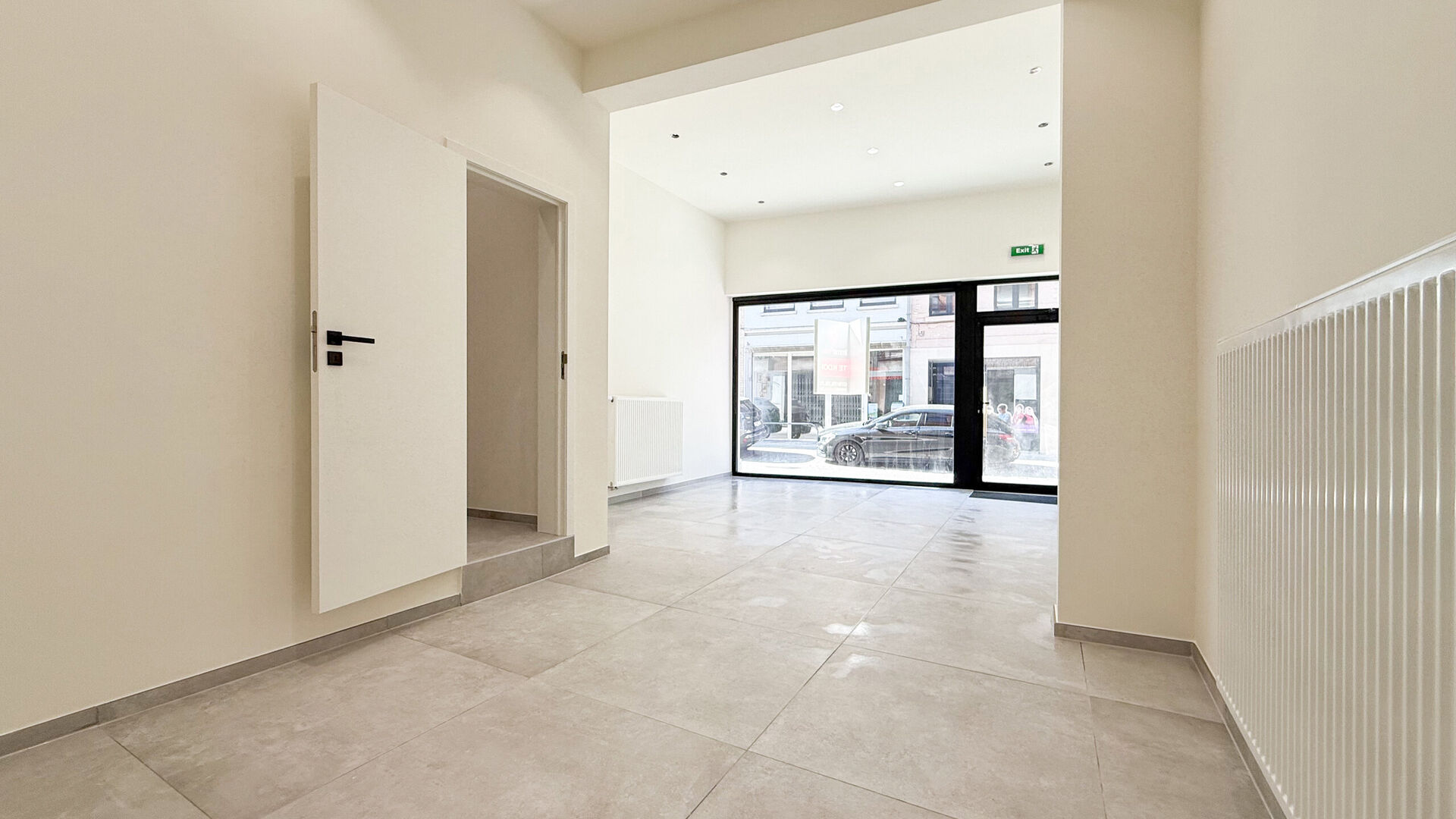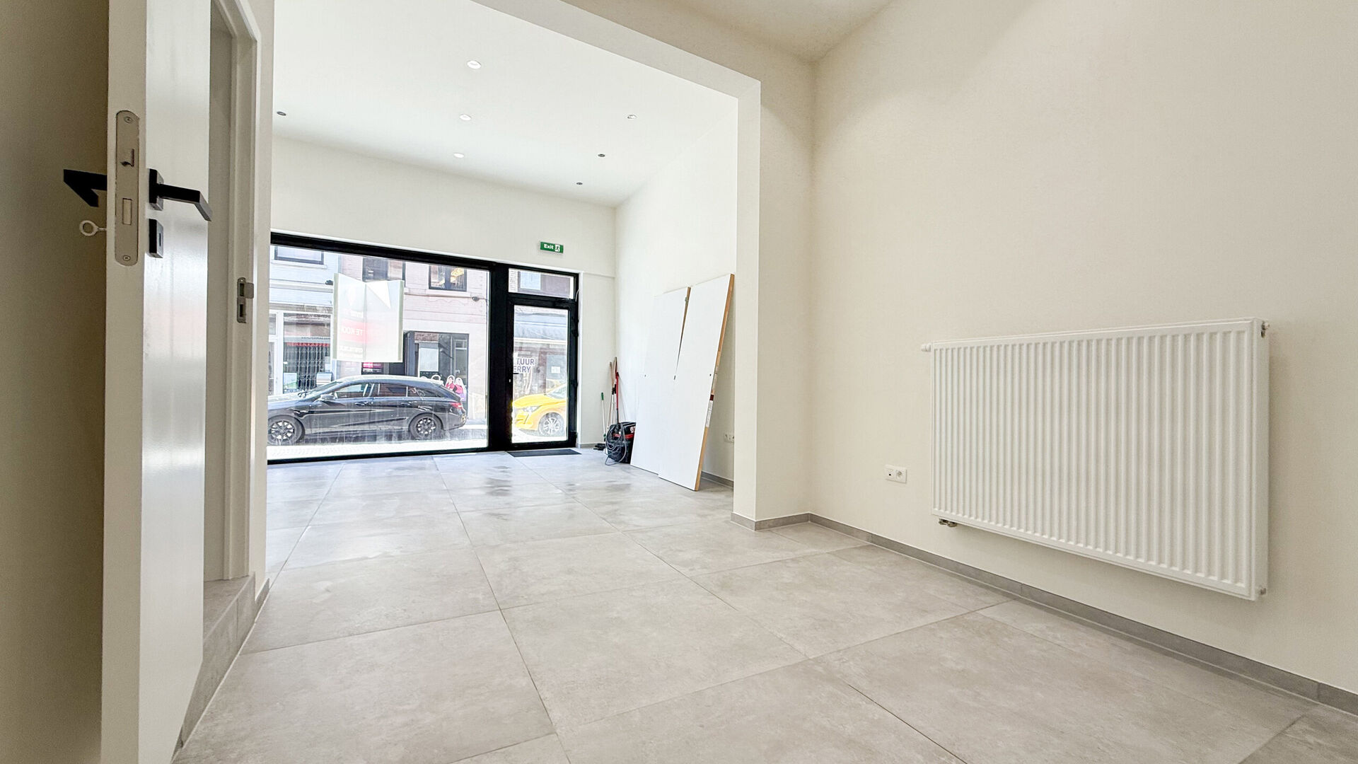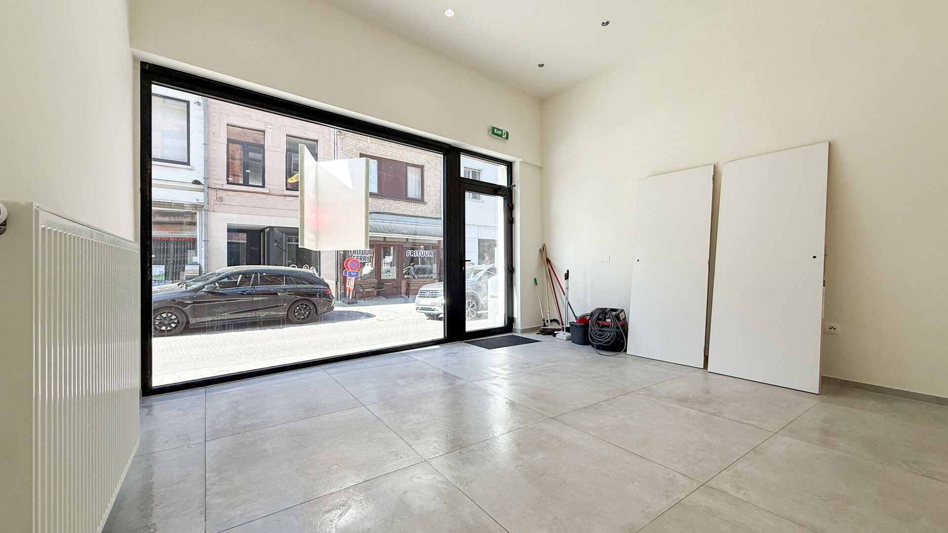 De handelsruimte beschikt over een aparte inkom en geniet van een uitstekende visibiliteit dankzij het grote raam aan de voorzijde. De ruimte omvat een open handelsgedeelte, een aparte vergaderruimte en een volledig ingebouwde keuken. Daarnaast is er een gastentoilet aanwezig. Achteraan bevindt zich een aangenaam terras van ca. 10 m².