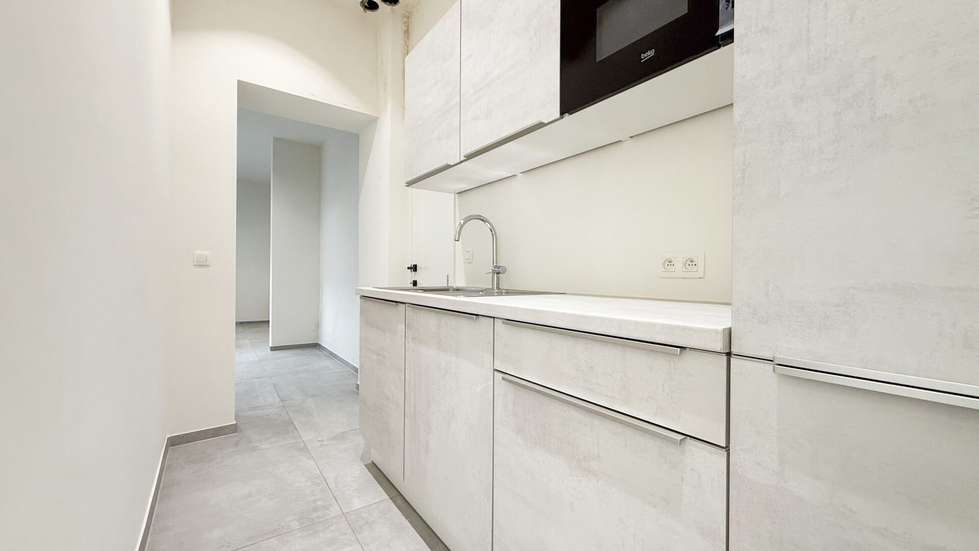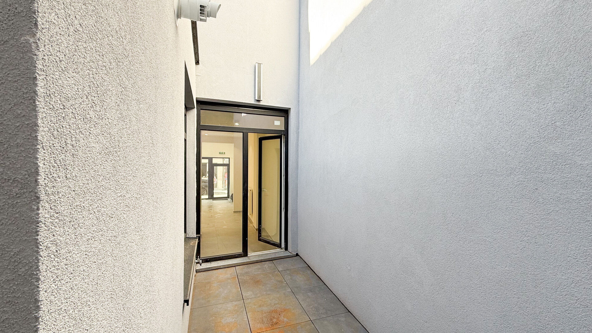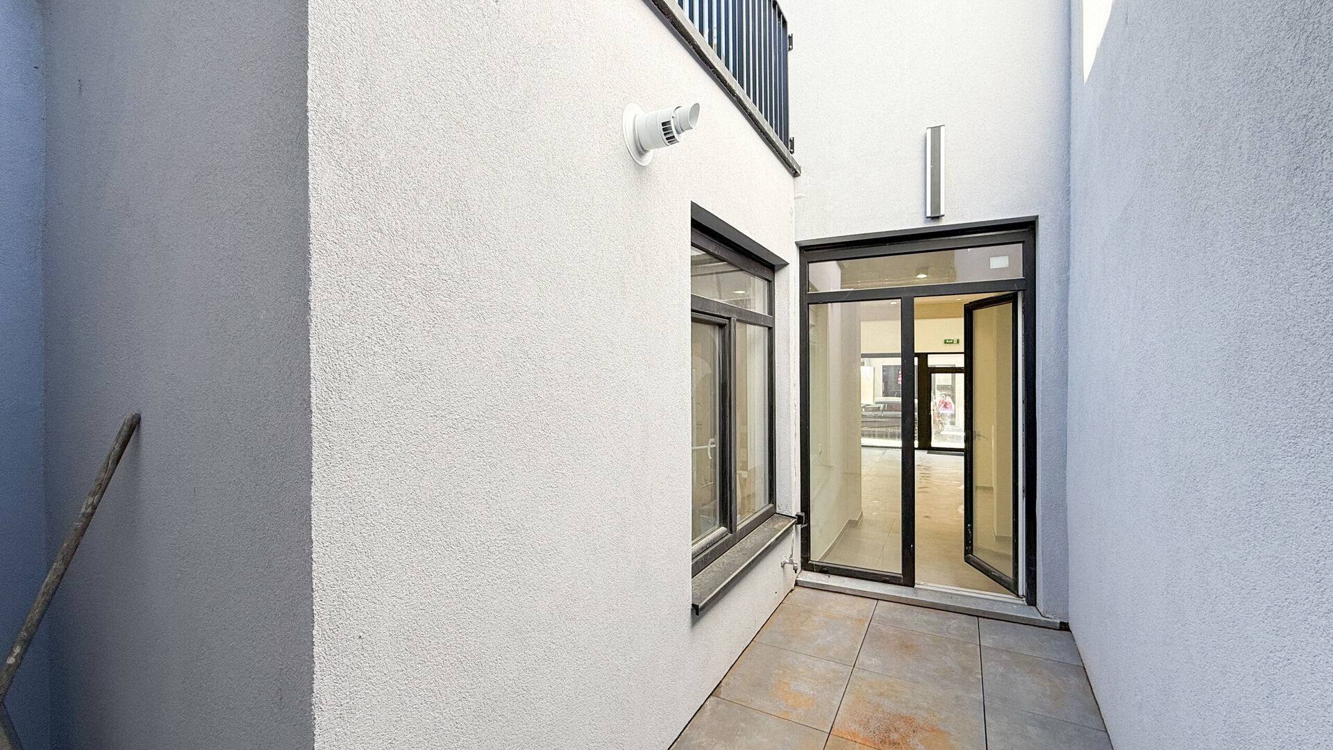 De handelsruimte beschikt over een aparte inkom en geniet van een uitstekende visibiliteit dankzij het grote raam aan de voorzijde. De ruimte omvat een open handelsgedeelte, een aparte vergaderruimte en een volledig ingebouwde keuken. Daarnaast is er een gastentoilet aanwezig. Achteraan bevindt zich een aangenaam terras van ca. 10 m².