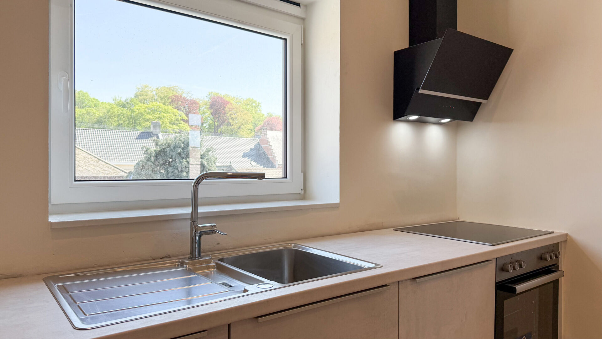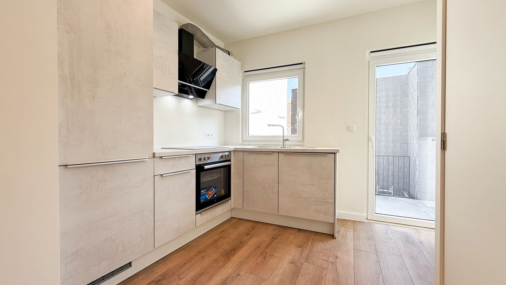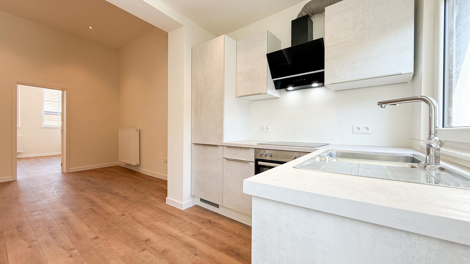Via de aparte inkom bereikt u het appartement op de eerste verdieping. De indeling is als volgt: inkomhal, twee slaapkamers aan de voorzijde, een lichtrijke woonkamer centraal, en achteraan een volledig ingerichte keuken en badkamer met toilet. Dit appartement beschikt bovendien over een ruim terras van ca. 20 m² aan de achterzijde.