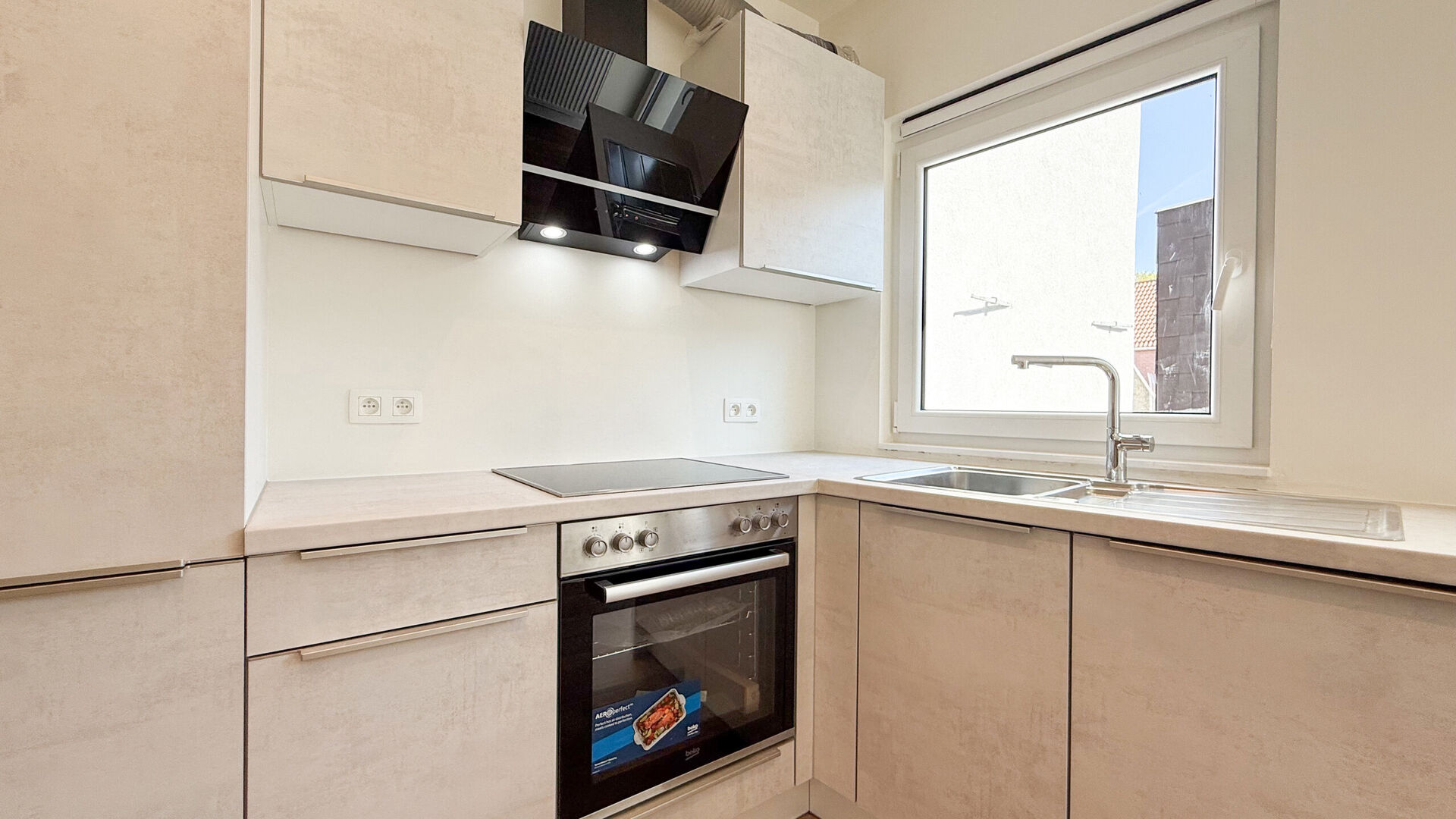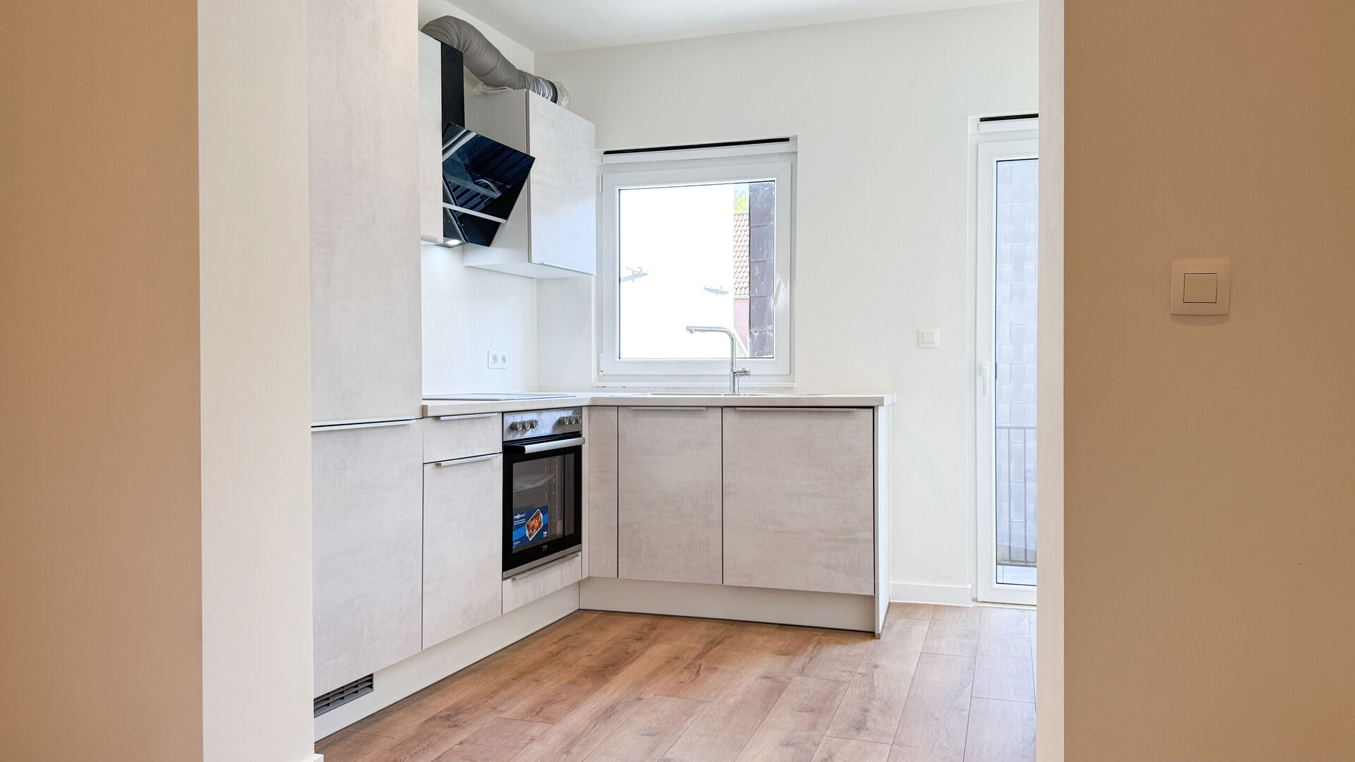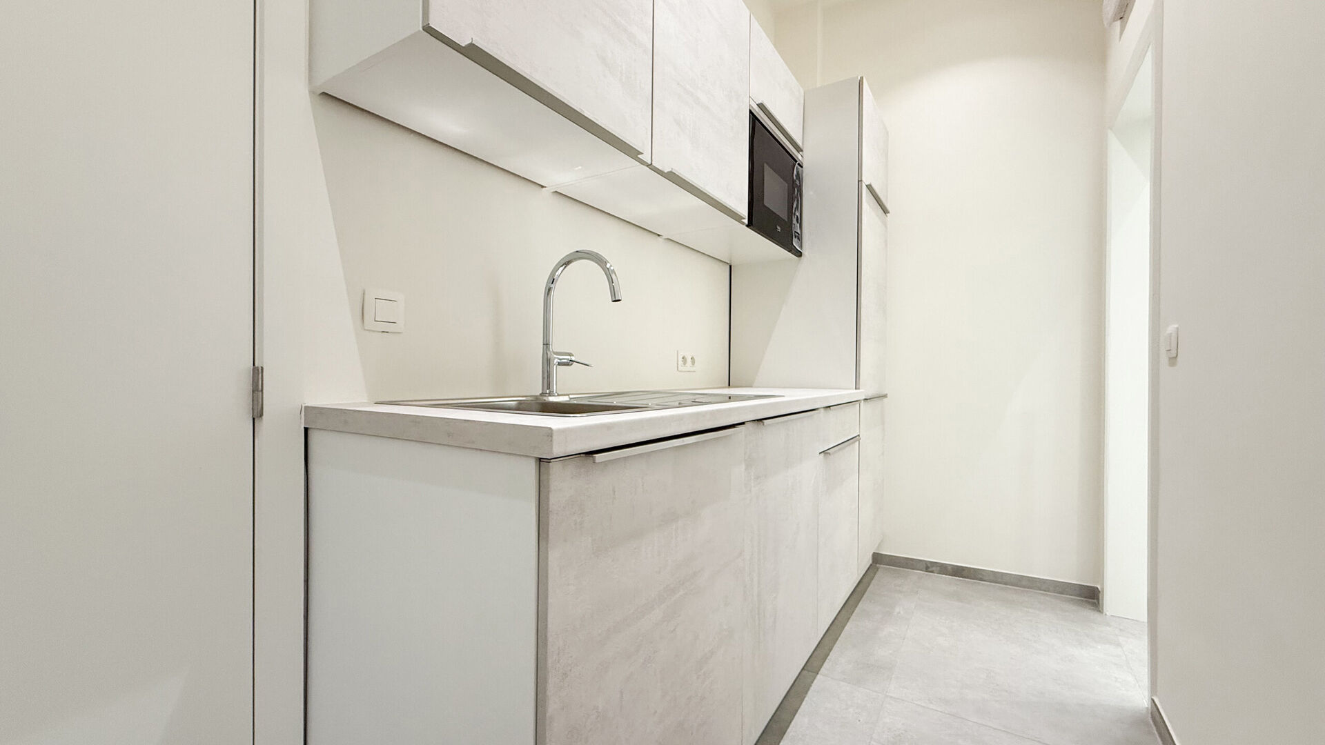 Via de aparte inkom bereikt u het appartement op de eerste verdieping. De indeling is als volgt: inkomhal, twee slaapkamers aan de voorzijde, een lichtrijke woonkamer centraal, en achteraan een volledig ingerichte keuken en badkamer met toilet. Dit appartement beschikt bovendien over een ruim terras van ca. 20 m² aan de achterzijde.