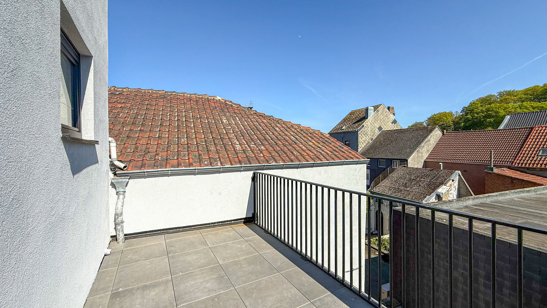 Op de tweede verdieping bevindt zich een ruim duplex appartement. Hier vindt u een woonkamer met trap naar de bovenliggende verdieping, een volledig geïnstalleerde keuken, badkamer met toilet en een terras van ca. 10 m². Op de bovenverdieping bevinden zich twee slaapkamers.